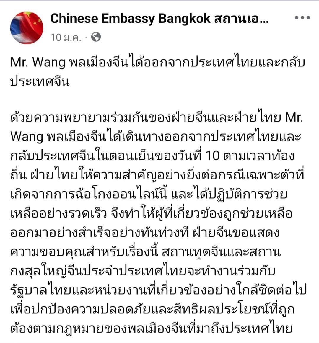 ด้านสถานเอกอัครราชทูตสาธารณรัฐประชาชนจีนประจำประเทศไทย ได้ออกแถลงการณ์แสดงความขอบคุณรัฐบาลไทย ซึ่งได้ทำการช่วยเหลือ นายหวังซิง” หรือ ซิงซิง นักแสดงชายชาวจีน ผ่านทางเว็บไซต์ของสถานเอกอัครราชทูตสาธารณรัฐประชาชนจีนประจำประเทศไทย ว่า สถานทูตจีนและสถานกงสุลใหญ่จีนประจำประเทศไทยขอขอบคุณรัฐบาลไทยและทุกฝ่ายที่เกี่ยวข้อง สำหรับความพยายามและการดำเนินงานอย่างมีประสิทธิภาพในการช่วยเหลือครั้งนี้ รวมทั้ง นายหวังซิง ได้แสดงความขอบคุณตำรวจไทย คนไทย และหน่วยงานที่เกี่ยวข้อง ที่ให้การช่วยเหลือจนสามารถกลับประเทศได้อย่างปลอดภัย