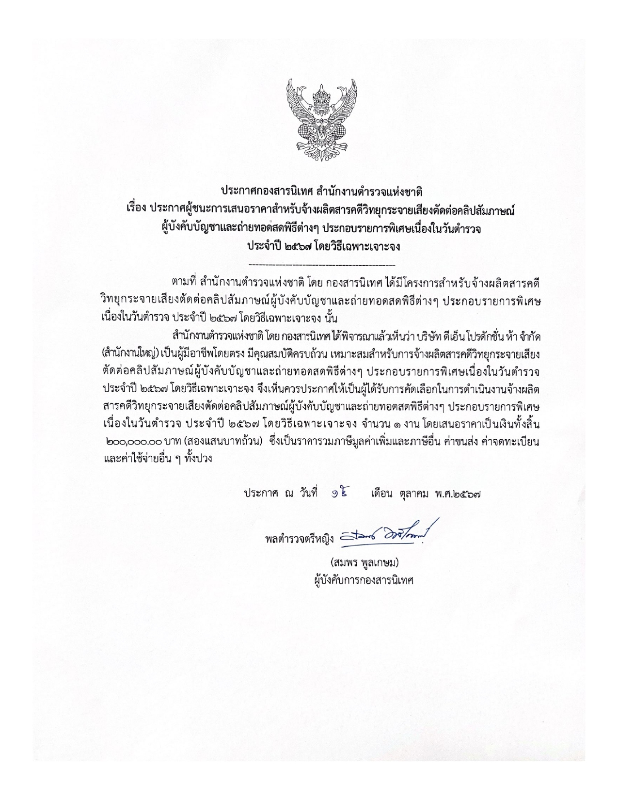 ประกาศกองสารนิเทศ สำนักงานตำรวจแห่งชาติ เรื่อง ประกาศผู้ชนะการเสนอราคาสำหรับจ้างผลิตสารคดีวิทยุกระจายเสียงตัดต่อคลิปสัมภาษณ์ผู้บังคับบัญชาและถ่ายทอดสดพิธีต่างๆ ประกอบรายการพิเศษเนื่องในวันตำรวจ ประจำปี 2567 โดยวิธีเฉพาะเจาะจง