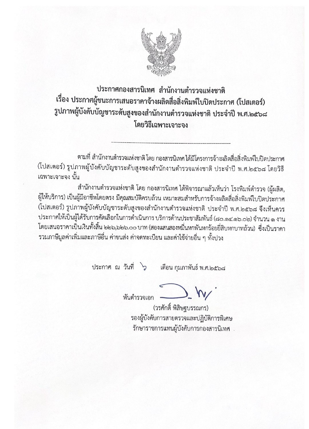 ประกาศกองสารนิเทศ สำนักงานตำรวจแห่งชาติ เรื่อง ประกาศผู้ชนะการเสนอราคาจ้างผลิตสื่อสิ่งพิมพ์ใบปิดประกาศ (โปสเตอร์) รูปภาพผู้บังคับบัญชาระดับสูงของสำนักงานตำรวจแห่งชาติ ประจำปี พ.ศ.2568 โดยวิธีเฉพาะเจาะจง