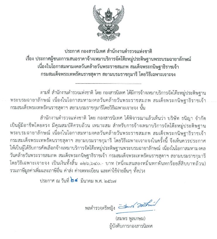 ประกาศ กองสารนิเทศ สำนักงานตำรวจแห่งชาติเรื่อง ประกาศผู้ชนะการเสนอราคาจ้างเหมาบริการจัดโต๊ะหมู่ประดิษฐานพระบรมฉายาลักษณ์ เนื่องในโอกาสมหามงคลวันคล้ายวันพระราชสมภพ สมเด็จพระกนิษฐาธิราชเจ้า กรมสมเด็จพระเทพรัตนราชสุดาฯ สยามบรมราชกุมารี โดยวิธีเฉพาะเจาะจง