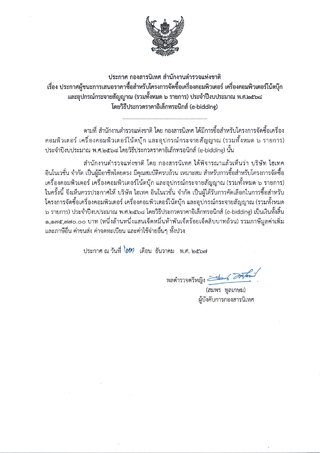 ประกาศ กองสารนิเทศ สำนักงานตำรวจแห่งชาติ เรื่อง ประกาศผู้ชนะการเสนอราคาซื้อสำหรับโครงการจัดซื้อเครื่องคอมพิวเตอร์ เครื่องคอมพิวเตอร์โน้ตบุ๊ก และอุปกรณ์กระจายสัญญาณ (รวมทั้งหมด 6 รายการ) ประจำปีงบประมาณ พ.ศ.2568 โดยวิธีประกวดราคาอิเล็กทรอนิกส์ (e-bidding)