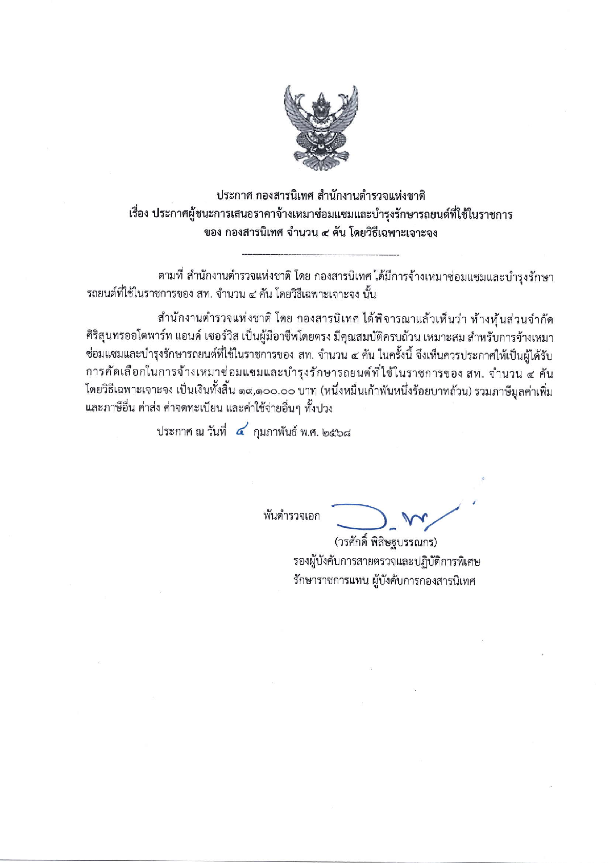 ประกาศ กองสารนิเทศ สำนักงานตำรวจแห่งชาติ เรื่อง ประกาศผู้ชนะการเสนอราคาจ้างเหมาซ่อมแซมและบำรุงรักษารถยนต์ที่ใช้ในราชการ ของ กองสารนิเทศ จำนวน 4 คัน โดยวิธีเฉพาะเจาะจง