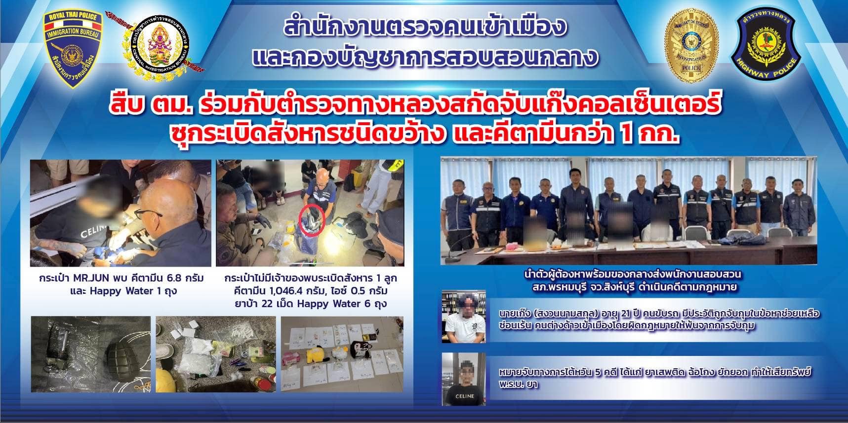 โดยในจำนวนนี้มีการจับกุมรายสำคัญหลายราย อาทิ การสกัดจับแก๊งคอลเซ็นเตอร์ซุกระเบิดสังหารชนิดขว้างและคีตามีน กว่า 1 กิโลกรัม และยาเสพติดชนิดอื่นๆ อีกจำนวนหนึ่ง ซึ่งเป็นปฏิบัติการร่วมระหว่างตำรวจตรวจคนเข้าเมือง ตำรวจสอบสวนกลาง และตำรวจท่องเที่ยว จับกุมผู้ต้องหา จำนวน 4 ราย เป็นสัญชาติไทย ไต้หวัน และ ฟิลิปปินส์ จากการตรวจสอบพบว่าผู้ต้องหาชาวไต้หวันที่ถูกจับกุม เป็นบุคคลที่ทางการไต้หวันได้ออกหมายจับ จำนวน 5 คดี และชาวฟิลิปปินส์ จำนวน 2 คน เชื่อว่าน่าจะถูกหลอกลวงไปทำงานแก๊งคอลเซ็นเตอร์ ในประเทศเมียนมา เจ้าหน้าที่ชุดจับกุมจึงได้ร่วมกับเจ้าหน้าที่พัฒนาสังคมและความมั่นคงของมนุษย์จังหวัดสิงห์บุรี คัดกรองเพื่อหาข้อบ่งชี้จากการค้ามนุษย์ตามกลไกส่งต่อระดับชาติ (NRM)