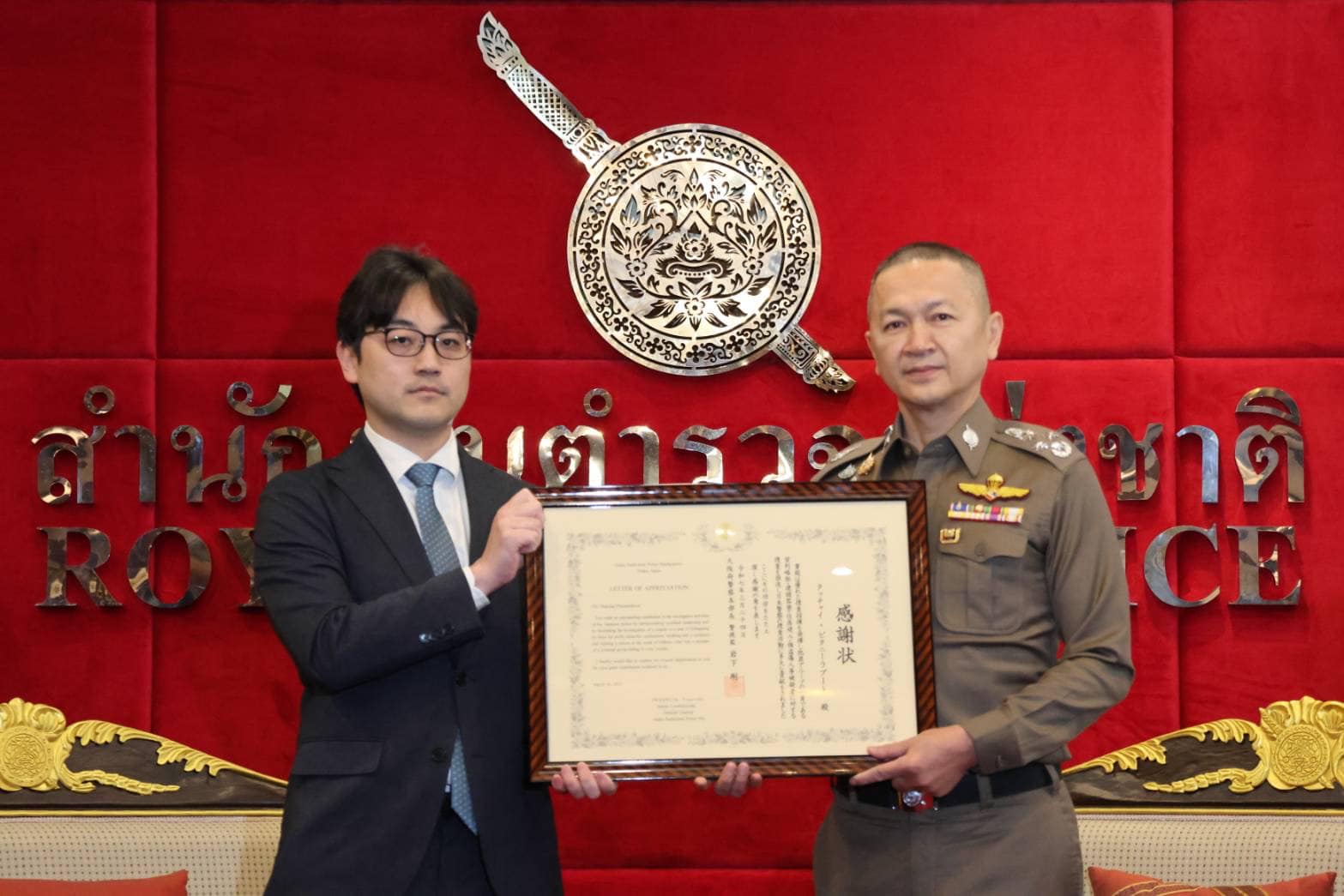 ผู้แทนสถานเอกอัครราชทูตญี่ปุ่น และสำนักงานตำรวจแห่งชาติญี่ปุ่น เข้าพบจเรตำรวจแห่งชาติ ขอบคุณตำรวจไทยที่จับกุมบุคคลตามหมายจับ และช่วยเหลือเหยื่อแก๊งคอลเซ็นเตอร์ชาวญี่ปุ่น พร้อมมอบเกียรติบัตรแก่คณะทำงาน