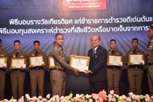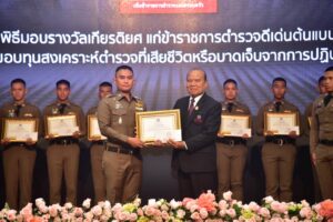 ผู้ที่เสียชีวิตหรือได้รับบาดเจ็บจากการปฏิบัติหน้าที่ ทุนการศึกษาแก่บุตร-ธิดา ข้าราชการตำรวจ ประจำปี 2567 โดยมี พล.ต.อ.สุนทร ซ้ายขวัญ, พล.ต.อ.วิเชียร พจน์โพธิ์ศรี, พล.ต.อ.ไกรสุข สินศุข,