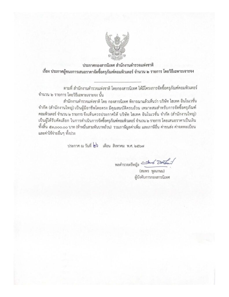 ประกาศกองสารนิเทศ สำนักงานตำรวจแห่งชาติเรื่อง ประกาศผู้ชนะการเสนอราคาจัดซื้อครุภัณฑ์คอมพิวเตอร์ จำนวน 2 รายการ โดยวิธีเฉพาะเจาะจง