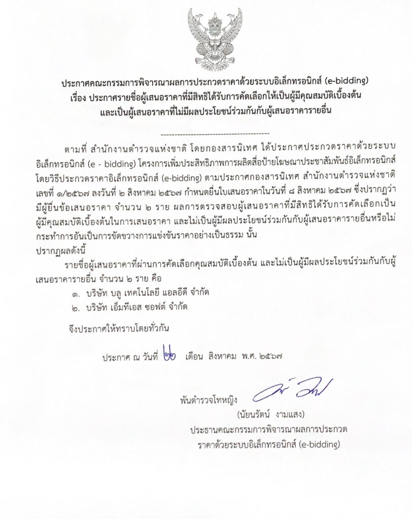 ประกาศคณะกรรมการพิจารณาผลการประกวดราคาด้วยระบบอิเล็กทรอนิกส์เรื่อง ประกาศรายชื่อผู้เสนอราคาที่มีสิทธิได้รับการคัดเลือกให้เป็นผู้มีคุณสมบัติเบื้องต้นและเป็นผู้เสนอราคาที่ไม่มีผลประโยชน์ร่วมกันกับผู้เสนอราคารายอื่น