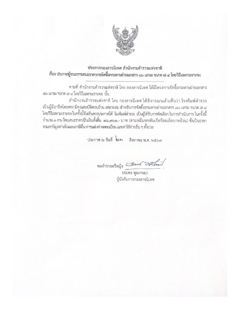 ประกาศกองสารนิเทศ สำนักงานตำรวจแห่งชาติเรื่อง ประกาศผู้ชนะการเสนอราคาการจัดซื้อกระดาษถ่ายเอกสาร 80 แกรม ขนาด เอ 4 โดยวิธีเฉพาะเจาะจง