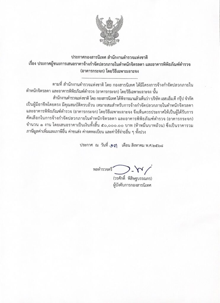 ระกาศกองสารนิเทศ สำนักงานตำรวจแห่งชาติ เรื่อง ประกาศผู้ชนะการเสนอราคาจ้างกำจัดปลวกภายในตำหนักจิตรลดา และอาคารพิพิธภัณฑ์ตำรวจ (อาคารกระจก) โดยวิธีเฉพาะเจาะจง