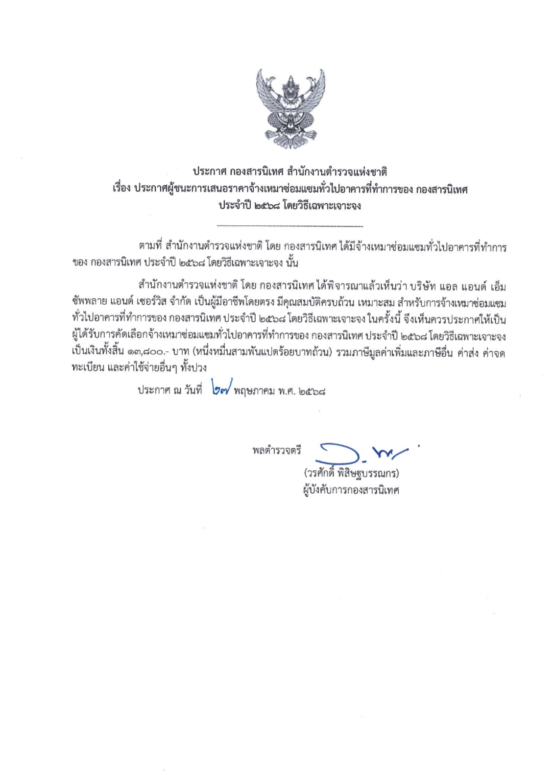 ประกาศ กองสารนิเทศ สำนักงานตำรวจแห่งชาติ เรื่อง ประกาศผู้ชนะการเสนอราคาจ้างเหมาซ่อมแซมทั่วไปอาคารที่ทำการของ กองสารนิเทศ ประจำปี 2568 โดยวิธีเฉพาะเจาะจง