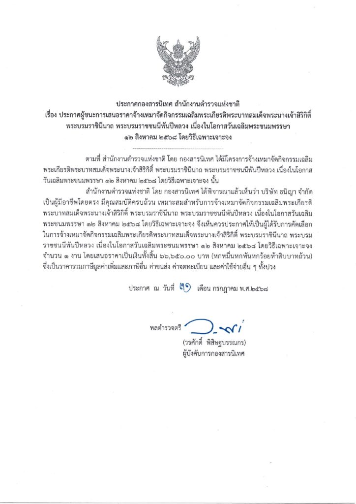 ประกาศกองสารนิเทศ สำนักงานตำรวจแห่งชาติ เรื่อง ประกาศผู้ชนะการเสนอราคาจ้างเหมาจัดกิจกรรมเฉลิมพระเกียรติพระบาทสมเด็จพระนางเจ้าสิริกิติ์ พระบรมราชินีนาถ พระบรมราชชนนีพันปีหลวง เนื่องในโอกาสวันเฉลิมพระชนมพรรษา 12 สิงหาคม 2568 โดยวิธีเฉพาะเจาะจง